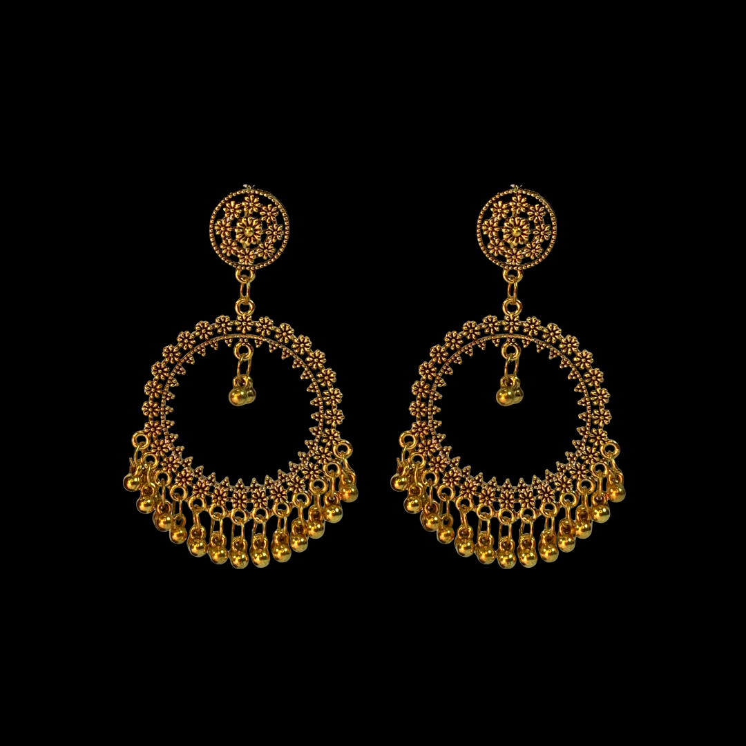Enhance your ethnic look with these stunning antique gold floral hoop jhumka earrings. Crafted with detailed floral engravings and hanging gold beads, these earrings bring out a perfect blend of vintage charm and traditional artistry. The circular design adds a graceful touch, making them ideal for festive occasions, cultural events, or even as a statement piece for everyday ethnic outfits.