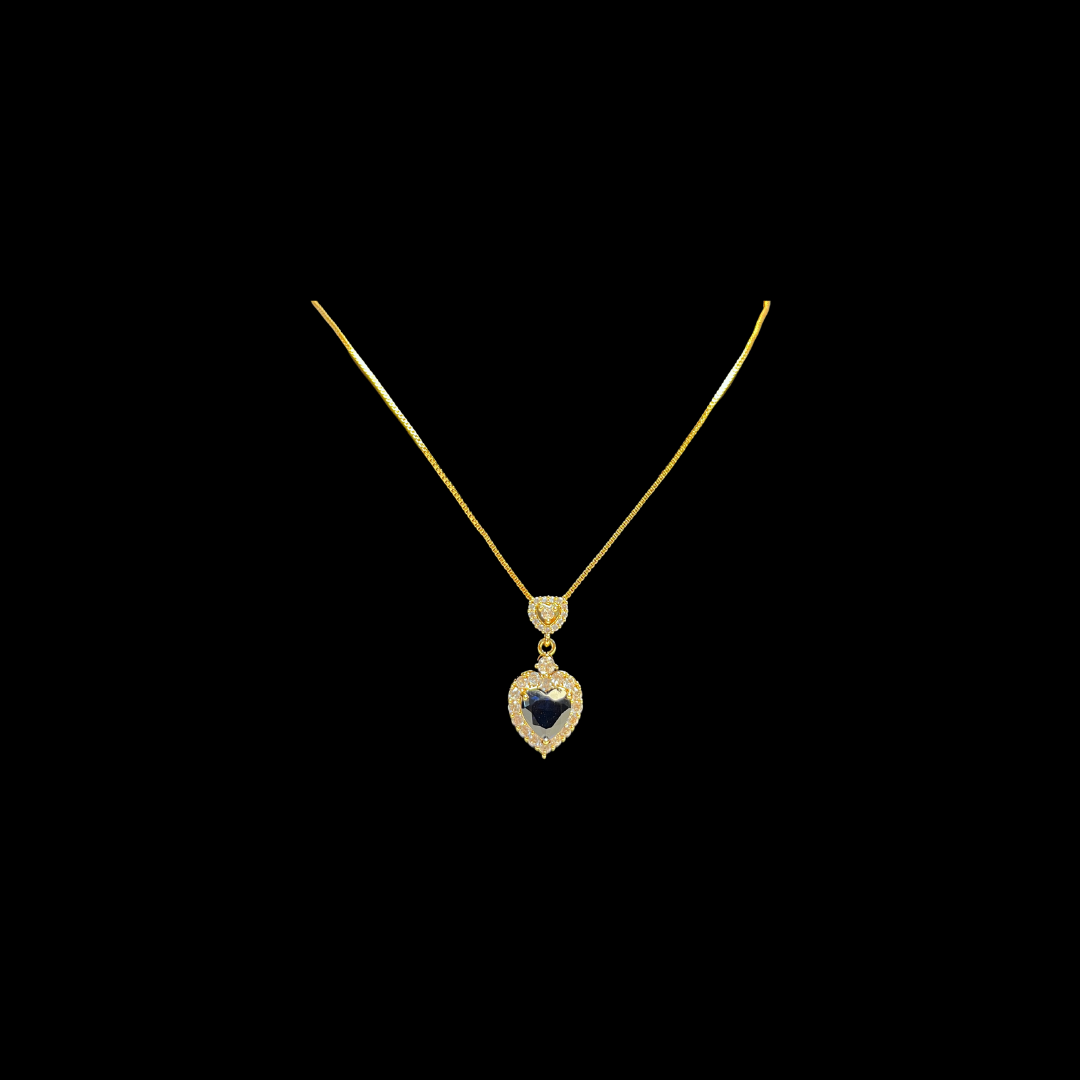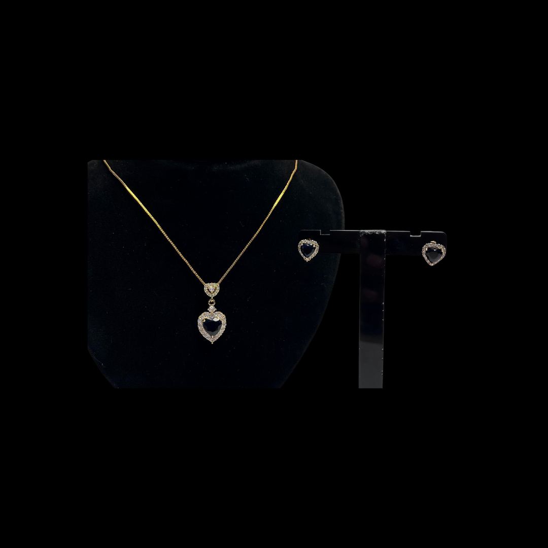 This elegant pendant set combines timeless charm with luxurious sparkle. The gold-toned chain holds a beautifully crafted heart-shaped pendant, centered with a rich blue crystal that adds depth and sophistication. Surrounding the centerpiece is a halo of shimmering diamond-style stones that enhance its brilliance and feminine appeal.