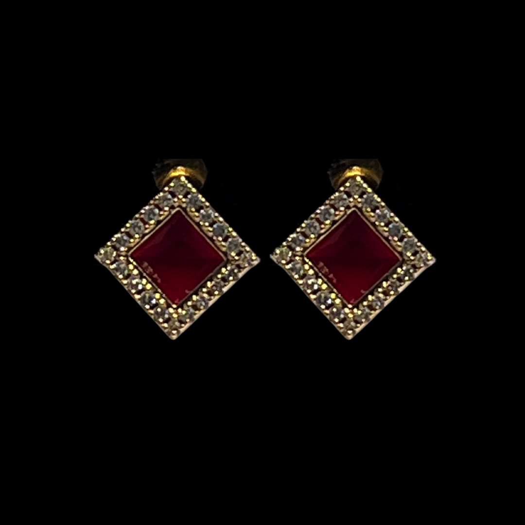 Each earring showcases a deep ruby-red stone at the center, beautifully encased in a golden frame adorned with glistening clear crystals. The striking color contrast creates an aura of luxury and charm, ideal for festive occasions or elevating your everyday attire.