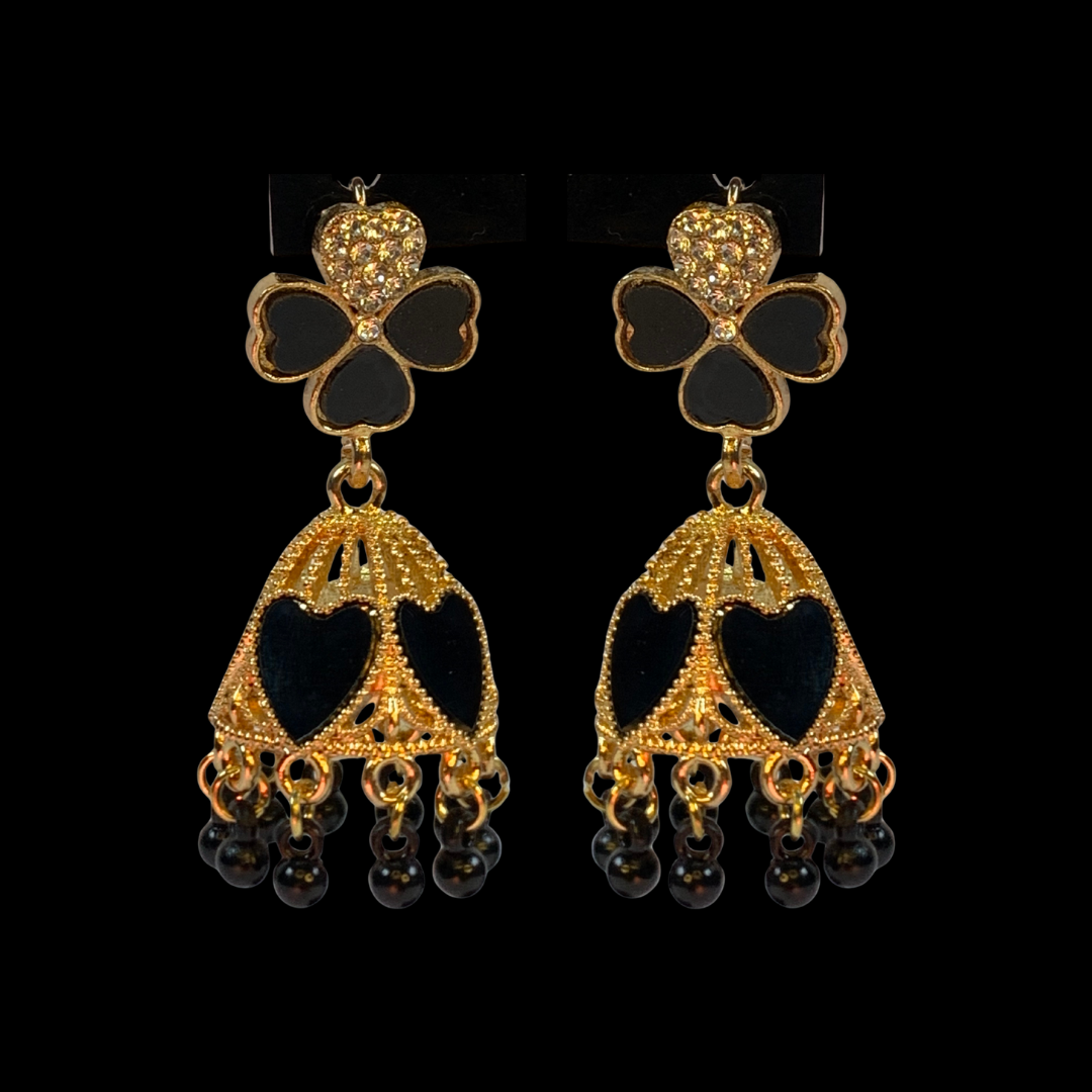 The lower jhumki dome showcases intricate gold filigree work with black heart-shaped enamel detailing, symbolizing grace and sophistication.